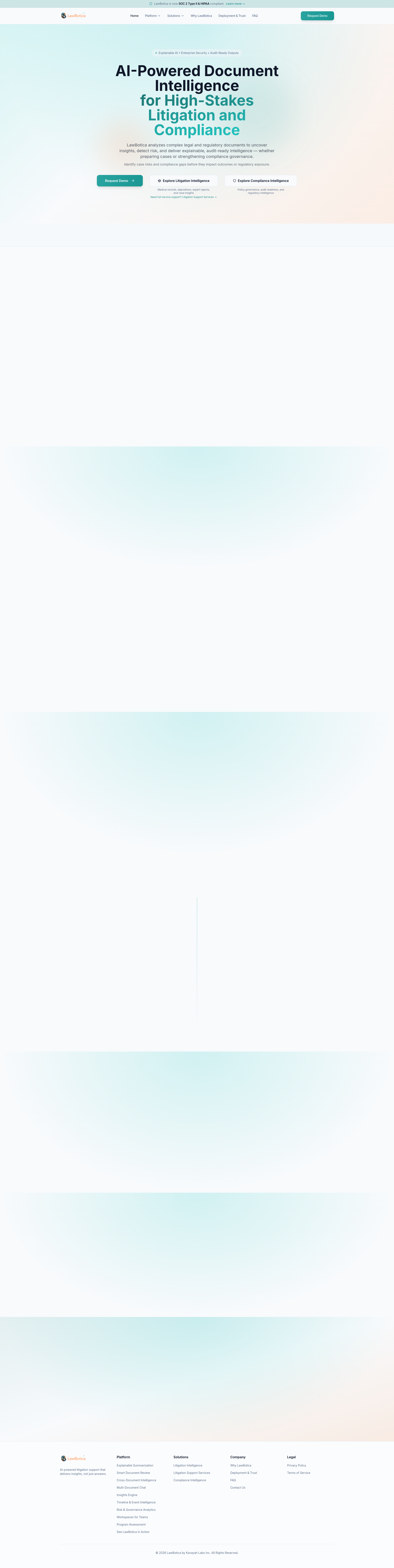 Key features of Lawbotica include: AI Document Review & Analysis: Automatically analyzes legal documents to identify key clauses, extract relevant information, and highlight critical details, significantly reducing manual review time.. Intelligent Legal Summarization: Condenses lengthy legal texts, such as contracts, case law, and regulations, into concise and accurate summaries, enabling quicker comprehension and decision-making.. Interactive Legal Chat Assistant: Provides an interactive AI chat interface where users can ask complex legal questions and receive accurate, well-researched answers supported by relevant legal precedents and statutes.. Legal Drafting Support: Assists legal professionals in drafting various legal documents, including contracts, briefs, and memos, by providing intelligent suggestions and relevant content.. Compliance & Risk Management: Identifies potential compliance issues and flags risks within legal documents, helping firms and legal departments mitigate liabilities and ensure regulatory adherence.. Secure Data Handling: Emphasizes robust data privacy and security protocols, ensuring that user data is protected and not used for training purposes, maintaining client confidentiality..